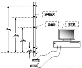 (10分)某同学利用透明直尺和光电计时器来验证机械能守恒定律,实验的简易示意图如图甲所示,当有不透光物体从光电门间通过时,光电计时器就可以显示物体的挡光时间。光电门传感器可测的最短时间为0.01ms。将挡光效果较好的黑色磁带(宽度为d)贴在透明直尺上,从一定高度由静止释放,并使其竖直通过光电门。某同学测得各段黑色磁带通过光电门的时间△ti与图中所示的高度差△hi ,并将部分数据进行了处理,结果如下表所示。(取g=9.8 m/s2,注:表格中M为直尺质量)
