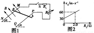 37°时,金属棒能达到的最大速度vm随电阻箱R2阻值的变化关系,如图2所示。取g =