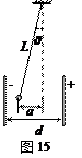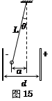 (10分)如图15所示,用长L=0.50m的绝缘轻质细线,把一个质量m=1.0g带电小球悬挂在带等量异种电荷的平行金属板之间,平行金属板间的距离d=5.0cm,两板间电压U=1.0×103V。静止时,绝缘线偏离竖直方向θ角,小球偏离竖直距离a=1.0cm。(θ角很小,为计算方便可认为tanθ≈sinθ,取g=10m/s2,需要求出具体数值,不能用θ角表示)求: