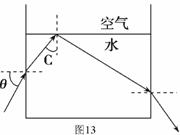 一束单色光由左侧射入盛有清水的薄壁圆柱形玻璃杯,图13为过轴线的截面图,调整入射角θ,光线恰好在水和空气的界面上发生全反射,已知水的折射率为