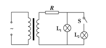 理想变压器原线圈接在电压不变的交流电源上,副线圈通过输电导线接两个相同的灯泡L1和L2,输电线的等效电阻为R,如图所示,开始时,开关S断开,当S接通时,以下说法中正确的是( ) ![]()