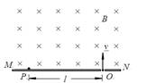 (8分)如图所示,MN表示真空室中垂直于纸面放置的感光板,它的一侧有匀强磁场,磁场方向垂直于纸面向里,磁感应强度大小为B. 一个电荷量为q的带电粒子从感光板上的狭缝O处以垂直于感光板的初速度v射入磁场区域,最后到达感光板上的P点. 经测量P、O间的距离为l,不计带电粒子受到的重力。求:
