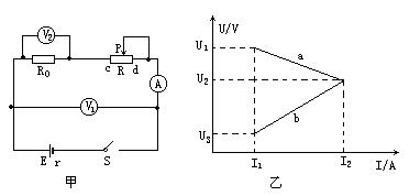 某同学利用图甲所示电路测定电源的电动势和内电阻.实验中电表内电阻对实验结果的影响很小,均可以忽略不计.闭合电键S后,变阻器的滑动触头P由受阻器的一端滑到另一端的过程中,两电压表示数随电流表示数变化情况分别如图乙的U-I图像中的直线a、b所示.