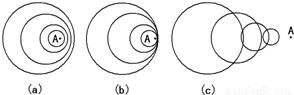 下列三张图片分别反映了飞机以三种不同速度在空中(不考虑空气的流动)水平飞行时,产生声波的情况。图中一系列圆表示声波的传播情况,A点表示飞机的位置。请你利用给出的图,确定飞机飞行速度最大的是________(填a、b、c)