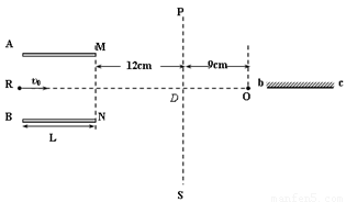 如图所示,两平行金属板A、B长8cm,两板间距离d=8cm,A板比B板电势高300V,一带正电的粒子电荷量q=10-10C,质量m=10-20kg,沿电场中心线RO垂直电场线飞入电场,初速度υ0=2×106m/s,粒子飞出平行板电场后经过界面MN、PS间的无电场区域后,进入固定在O点的点电荷Q形成的电场区域,(设界面PS右边点电荷的电场分布不受界面的影响),已知两界面MN、PS相距为12cm,D是中心线RO与界面PS的交点,O点在中心线上,距离界面PS为9cm,粒子穿过界面PS最后垂直打在放置于中心线上的荧光屏bc上。(静电力常数k = 9.0×109N·m2/C2)(粒子重力忽略不计)