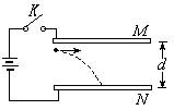 相距为d的M、N两平行金属板与电池相连接,如图所示。一带电粒子从M极板边缘,垂直于电场方向射入,并打到N板的中心。现欲使粒子原样射入,但能射出电场,不计重力,就下列两种情况,分别求出N板向下移动的距离。