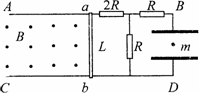 如图,在竖直面内有两平行金属导轨AB、CD.导轨间距为L,电阻不计.一根电阻不计的金属棒ab可在导轨上无摩擦地滑动.棒与导轨垂直,并接触良好.导轨之间有垂直纸面向外的匀强磁场,磁感强度为B.导轨右边与电路连接.电路中的三个定值电阻阻值分别为2R、R和R.在BD间接有一水平放置的平行板电容器C,板间距离为d.