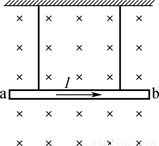 如图所示,在匀强磁场中用两根柔软绝缘的细线将金属棒ab悬挂在水平位置上,金属棒中通入由a到b的恒定电流I,这时两根细线均被拉紧,现要想使两根细线对金属棒拉力变为零,可采用哪些方法![]()