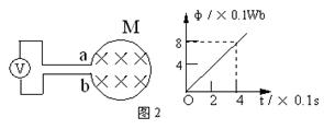 如图2所示,n=50匝的圆形线圈M,它的两端点a、b与内阻很大的电压表相连,线圈中磁通量的变化规律如图所示,则ab两点的电势高低与电压表的读数为: