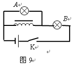 如图9所示,A、B两灯相同,L是带铁芯的电阻可不计的线圈,下列说法中正确的是 ( )![]()
