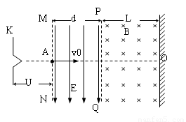 如图所示,K与虚线MN之间是加速电场,虚线MN与PQ之间是匀强电场,虚线PQ与荧光屏之间是匀强磁场,且MN、PQ与荧光屏三者互相平行,电场和磁场的方向如图所示,图中A点与O点的连线垂直于荧光屏.一带正电的粒子从A点离开加速电场,速度方向垂直于偏转电场方向射入偏转电场,在离开偏转电场后进入匀强磁场,最后恰好垂直地打在荧光屏上.已知电场和磁场区域在竖直方向足够长,加速电场电压与偏转电场的场强关系为U=