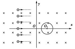如图所示,XOY坐标系内有匀强磁场,磁感应强度为B,方向垂直纸面向里,X〈0区域内有匀强电场(图中未画出),Y轴为电场右边界。磁场中放置一半径为R的圆柱形圆筒,圆心O1的坐标为(2R,0),圆筒轴线与磁场平行.现有范围足够大的平行电子束以速度v0从很远处垂直于Y轴沿X轴正方向做匀速直线运动射入磁场区,已知电子质量为m,电量为e.不考虑打到圆筒表面的电子对射入磁场的电子的影响,电子重力忽略不计。求: