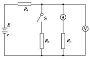 (2)当S闭合后,电压表的示数、以及R2上消耗的电功率。![]()