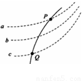 如图所示,虚线a、b、c代表电场中三个等势面,相邻等势面之间的电势差相等,即Uab = Ubc,实线为一带电的质点仅在电场力作用下通过该区域时的运动轨迹,P、Q是这条轨迹上的两点,根据以上信息可以确定的是![]()