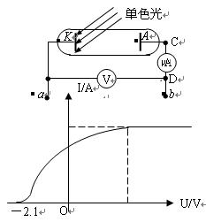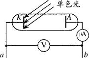 如图所示是做光电效应实验的装置简图。在抽成真空的玻璃管内,K为阴极(用金属铯制成,发生光电效应的逸出功为1.9eV),A为阳极。在a、b间不接任何电源,用波长为λ的单色光照射阴极K,会发现电流表指针有偏转。这时,若在a、b间接入直流电源,实验发现光电流与所加电压的关系如图,求: