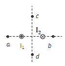 两根通电直导线平行放置,电流分别为I1和I2,电流方向如图所示,且I1>I2在与导线垂直的平面上有a、b、c、d四点,其中a、b在导线横截面连线的延长线上,c、d在导线连线的垂直平分线上。则导体中的电流在这四个点产生的磁感应强度可能为零的是:( )![]()