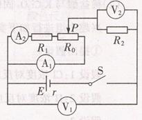 如图所示电路中,电源E的内阻为r,R1、R2为定值电阻,R0为滑动变阻器的最大里值, 各电表均为理想电表.已知r<R2,电阻R1<R0.闭合开关S, 当滑动变阻器的滑动触头P由变阻器的中点向左滑动的 过程中,下列说法正确的是