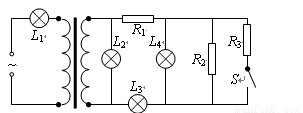 如图所示,变压器为理想变压器,原线圈两端接电压一定的正弦交流电源。当开关S闭合时,各盏灯的亮暗变化情况应是