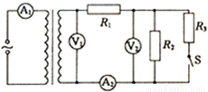 为理想交流电压表,R1、R2.R3为定值电阻,原线圈两端接电压一定的正弦交流电源。当开关S闭合时,各交流电表的示数变化情况应是 ( )