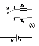 如图所示,R1=14Ω,R2=9Ω。当开关处于位置1时,电流表读数I1=0.2A;当开关处于位置2时,电流表读数I2=0.3A。求电源的电动势E和内电阻r。![]()