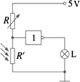 如图所示为包含某逻辑电器的一个简单电路图,L为小灯泡。光照射电阻R`时,其阻值将变得远小于R。该逻辑电路是 (填“与”“或”或“非”)门电路。当电阻R`受到光照时小灯泡L将 (填“发光”或“不发光”)。![]()