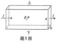 如题5图所示,一段长方体形导电材料,左右两端面的边长都为a和b,内有带电量为q的某种自由运动电荷。导电材料置于方向垂直于其前表面向里的匀强磁场中,内部磁感应强度大小为B。当通以从左到右的稳恒电流I时,测得导电材料上、下表面之间的电压为U,且上表面的电势比下表面的低。由此可得该导电材料单位体积内自由运动电荷数及自由运动电荷的正负分别为