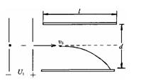 一束电子流在U1=500V的电压作用下加速度后垂直于平行板间的匀强电场飞入两板间的中央,如图所示。若平行板间的距离d=1cm,板长l=5cm,求:至少在平行板上加多大电压U2才能使电子不再飞出平行板?