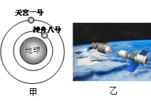 2011年9月29日晚21时16分,我国将飞行器天宫一号发射升空,它将在两年内分别与神舟八号、神舟九号、神舟十号飞船对接,从而建立我国第一个空间实验室。假如神舟八号与天宫一号对接前所处的轨道如图甲所示,图乙是它们在轨道上即将对接时的模拟图。当它们处于图甲所示的轨道运行时,下列说法正确的是