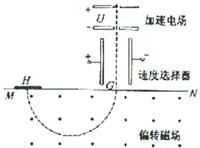 如图所示为质谱仪的原理示意图,电荷量为q、质量为m的带正电的粒子从静止开始经过电势差为U的加速电场后进入粒子速度选择器,选择器中存在相互垂直的匀强电场和匀强磁场,匀强电场的场强为E、方向水平向右.已知带电粒子能够沿直线穿过速度选择器,从G点垂直MN进入偏转磁场,该偏转磁场是一个以直线MN为边界、方向垂直纸面向外的匀强磁场.带电粒子经偏转磁场后,最终到达照相底片的H点.可测量出G、H间的距离为l.带电粒子的重力可忽略不计.粒子速度选择器中匀强磁场的磁感强度B1的大小为 ;偏转磁场的磁感强度B2的大小为 。![]()