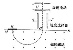 (15分)如图所示为质谱仪的原理示意图,电荷量为q、质量为m的带正电的粒子从静止开始经过电势差为U的加速电场后进入粒子速度选择器,选择器中存在相互垂直的匀强电场和匀强磁场,匀强电场的场强为E、方向水平向右。已知带电粒子能够沿直线穿过速度选择器,从G点垂直MN进入偏转磁场,该偏转磁场是一个以直线MN为边界、方向垂直纸面向外的匀强磁场。带电粒子经偏转磁场后,最终到达照相底片的H点。可测量出G、H间的距离为