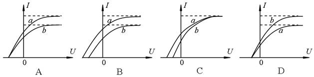 在光电效应实验中,先后用频率相同但光强不同的两束光照射同一个光电管。若实验a中的光强大于实验b中的光强,实验所得光电流I与光电管两端所加电压U间的关系曲线分别以a、b表示,则下列图中可能正确的是( )