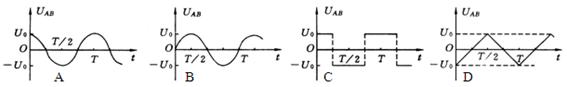 如图所示,在两平行金属板中央有一个静止的电子(不计重力),当两板间加上如图所示的交变电压后,能使电子有可能做往返运动的电压是( )