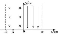 如图,在xoy平面内第二象限-10cm≤x≤0区域内有垂直纸面向内的匀强磁场B,其大小为0.2T,在A(-6cm,0)点有一粒子发射源,向x轴上方180°范围内发射v=2.0×107m/s的负粒子,粒子的比荷为2.0×109C/kg,不计粒子重力,求:![]()