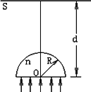 如图所示,一束截面为圆形半径为R的平行单色光,垂直射向一玻璃半球的平面,经折射后在屏幕S上形成一个圆形亮区,已知玻璃半球的半径为R,屏幕S到球心的距离为d(d>3R),不考虑光的干涉和衍射,玻璃对该光的折射率为n,求屏幕上被照亮区域的半径。