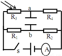 如图所示,R3是光敏电阻,a、b两点间接一电容,当开关S闭合后,在没有光照射时,电容上下极板上电量为零,当用光线照射电阻R3时 ( )