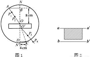 (1)某同学由于没有量角器,在完成了光路以后,他以O点为圆心、10.00 cm长为半径画圆,分别交线段OA于A点,交OO′连线延长线于C点,过A点作法线NN′的垂线AB交NN′于点B,过C点作法线NN′的垂线CD交NN′于D点,如图所示.用刻度尺量得OB=8.00cm,CD=4.00cm.由此可得出玻璃的折射率n=_______.