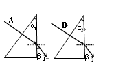 图示为两个同种玻璃制成的棱镜,顶角α1略大于α2,两束单色光A和B分别垂直射于三棱镜后,出射光线与第二界面的夹角 β1= β2,则![]()