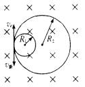 如图所示,在匀强磁场中,一个原来静止的原于核,由于天然衰变放出一个粒子而得到相内切的两条圆形轨迹,两圆半径之比为44∶1,则该放射性元素的原子序数为 ( )