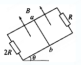宽度为L,足够长的光滑倾斜导轨与水平面间夹角为θ,匀强磁场磁 感应强度为B,方向垂直于导轨向上,范围足够大,导轨的上端连着一个阻值为R的电阻,下端连着一个阻值为2R的电阻,导轨电阻不计。金属棒ab长为L,质量为m,电阻也为R,垂直地放在导轨上。在某一平行于导轨向上的恒力(图中未画出)的作用下,ab棒从静止开始沿导轨向上运动,最后达到稳定的运动状态。整个过程中,通过斜面底端电阻2R的最大电流为I,求:![]()