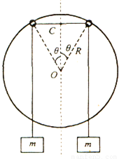 如图所示,半径为R、圆心为O的大圆环固定在竖直平面内,两个轻质小圆环套在大圆环上.一根轻质长绳穿过两个小圆环,它的两端都系上质量为m的重物,忽略小圆环的大小。