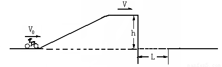 如图所示,摩托车运动员做飞越壕沟的特技表演,摩托车以初速度V 0冲上顶部水平的高台,高台后面是一条宽L=10m的壕沟,若摩托车冲上高台过程中以恒定功率P=1.8kW行驶,经历时间t=5s,到达高台顶部时立即关闭发动机,摩托车在水平的高台上做匀速直线运动一段距离后飞离高台。已知人和车的总质量m=180kg(可视为质点),平台高h=5m,忽略空气阻力和摩擦阻力。取g=10m/s 2。问:(1)V 0至少应多大?(2)假定摩托车落地速度大小超过Vm =30m/s时会对运动员造成危险,则摩托车飞离高台时的最大速度Vm′应为多少?![]()