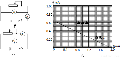 在测定水果电池的电动势和内阻时,某实验小组选取相同的实验器材,分别用甲、乙两种电路进行实验.其中一种电路测得的实验数据作出的U-I图线,如图丙中图线1所示,另一电路测得的实验数据如下表.