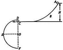 | 如图所示,ABC和DEF是在同一竖直平面内的两条光滑轨道,其中ABC的末端水平,DEF是半径为r=0.4m的半圆形轨道,其直径DF沿竖直方向,C、D可看作重合。现有一质量m=0.1kg,可视为质点的小球从轨道ABC上的A点由静止释放,若小球经C处后恰能沿轨道DEF做圆周运动(取g=10m/s2),求: (1)小球释放点A距C点的竖直高度H; (2)小球到达F点时对轨道的压力是多大? |