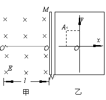 如图甲所示,图的右侧MN为一竖直放置的荧光屏,O为它的中点,OO’与荧光屏垂直,且长度为l.在MN的左侧空间内存在着方向水平向里的匀强电场,场强大小为E.乙图是从甲图的左边去看荧光屏得到的平面图,在荧光屏上以O为原点建立如图的直角坐标系.一细束质量为m、电量为q的带电粒子以相同的初速度v0从O’点沿O’O方向射入电场区域.粒子的重力和粒子间的相互作用都可忽略不计.