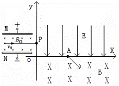 如图所示,相距为d的平行金属板M、N间存在匀强电场和垂直纸面向里、磁感应强度为Bo的匀强磁场;在xoy直角坐标平面内,第一象限有沿y轴负方向场强为E的匀强电场,第四象限有垂直坐标平面向里、磁感应强度为B的匀强磁场。一质量为m、电量为q的正离子(不计重力)以初速度Vo沿平行于金属板方向射入两板间并做匀速直线运动。从P点垂直y轴进入第一象限,经过x轴上的A点射出电场,进入磁场。已知离子过A点时的速度方向与x轴成45o角。求: