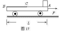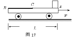 如图17所示,光滑水平地面上停着一辆平板车,其质量为2m,长为L,车右端(A点)有一块静止的质量为m的小金属块.金属块与车间有摩擦,与中点C为界, AC段与CB段摩擦因数不同.现给车施加一个向右的水平恒力,使车向右运动,同时金属块在车上开始滑动,当金属块滑到中点C时,即撤去这个力.已知撤去力的瞬间,金属块的速度为v0,车的速度为2v0,最后金属块恰停在车的左端(B点)。如果金属块与车的AC段间的动摩擦因数为
