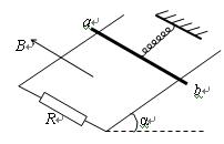 (19分) 如图所示,光滑的金属导轨间距为L,导轨平面与水平面成α角,导轨下端接有阻值为R的电阻,质量为m的金属细杆ab与绝缘轻质弹簧相连静止在导轨上,弹簧劲度系数为k,上端固定,弹簧与导轨平面平行,整个装置处在垂直于导轨平面斜向上的匀强磁场中,磁感应强度为B.现给杆一沿轨道向下的初速度v0,杆向下运动至速度为零后,再沿轨道平面向上运动达最大速度,大小为v1,然后减速为零,再沿轨道平面向下运动……一直往复运动到静止(导轨与金属杆的电阻忽略不计).试求: