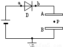 D是一只理想二极管(a正极:电流只能从a流向b,而不能从b流向a)。平行板电容器A、B两极板间有一电荷在P点处于静止。以E表示两极板间电场强度,U表示两极板间电压,EP表示电荷在P点电势能。若保持极板B不动,将极板A稍向上平移,则