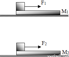 如图,在光滑水平面上,放着两块长度相同,质量分别为M1和M2的木板,在两木板的左端各放一个大小、形状、质量完全相同的物块,开始时,各物均静止,今在两物体上各作用一水平恒力F1、F2,当物块和木板分离时,两木板的速度分别为v1和v2,,物体和木板间的动摩擦因数相同,下列说法正确的是