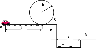 在一次特技表演中,一电动小车的运动路径运动如图所示,小车从A点由静止出发,沿粗糙的水平直轨道运动L后,由B点进入半径为R的光滑竖直圆形轨道,运动一周后又从B点离开圆轨道进入水平光滑轨道BC段,在C与平面D间是一水池.已知小车质量m=0.1 kg、L=10 m、R=0.32 m、h=1.25 m、s=1.50 m,在AB段所受阻力为0.3 N.小车只在AB路段可以施加牵引力,牵引力的功率为P=1.2 W,其他路段电动机关闭.问:要使小车能够顺利通过圆形轨道的最高点且能落在右侧平台D上,小车电动机至少工作多长时间?(g取10 m/s2)
